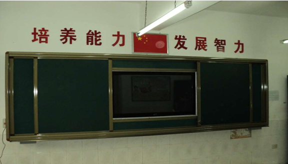 2. 外滑軌裝置:安裝兩塊移動(dòng)綠板,兩綠板尺寸之和與內(nèi)軌道白板的尺寸一致;進(jìn)行常規(guī)教學(xué)時(shí),可將此綠板滑動(dòng)到液晶電視前方,保護(hù)液晶觸摸一體機(jī),增大書寫面積;進(jìn)行多媒體教學(xué)時(shí),將綠板拉開,使用液晶觸摸一體機(jī)。